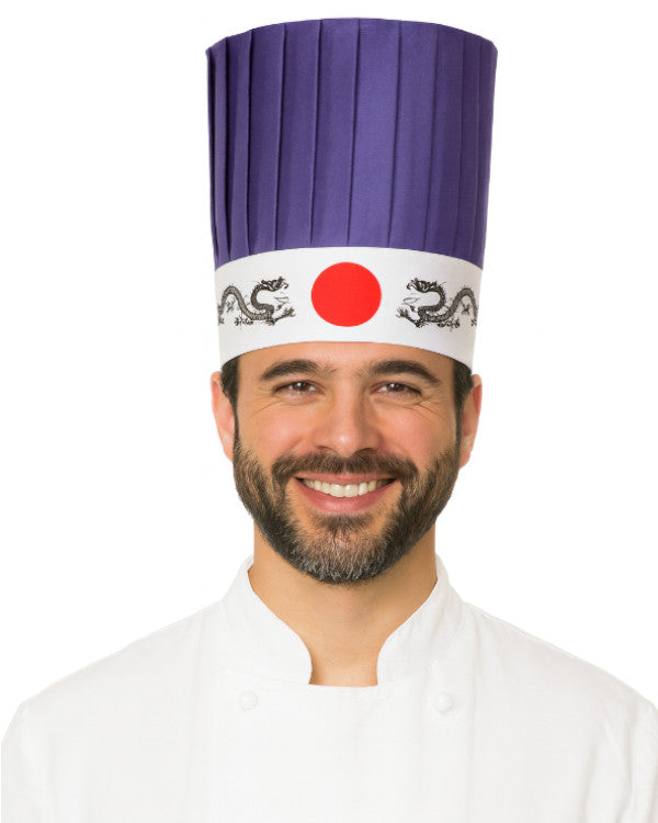 This hat set includes a chef tall purple hat and Japanese style headband specifically designed for Hibachi chefs and is made from high-quality polycotton material, making it perfect for use in Japanese restaurants, food service, and industrial settings.