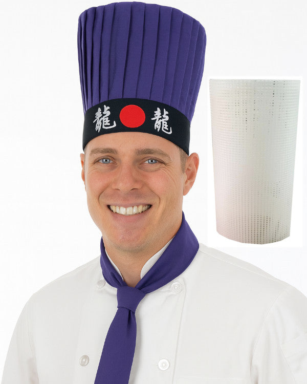 This 4-piece set includes a purple tall hat, headband with the Japanese word "dragon," a purple necktie, and a plastic insert net. Our Hibachi Chef Hat Set offers a wide range of options and is crafted with high-quality materials. The set is designed for easy ordering and includes a comfortable cotton and polyester blend (35% and 65%, respectively) with a Velcro closure for adjustable head circumference (21" to 23.5"). The tall hat measures 12" H, the headband is 39" L x 2" W, and the necktie and plastic insert net are both 39" L x 2" W and 10.5 x 27 inches, respectively.